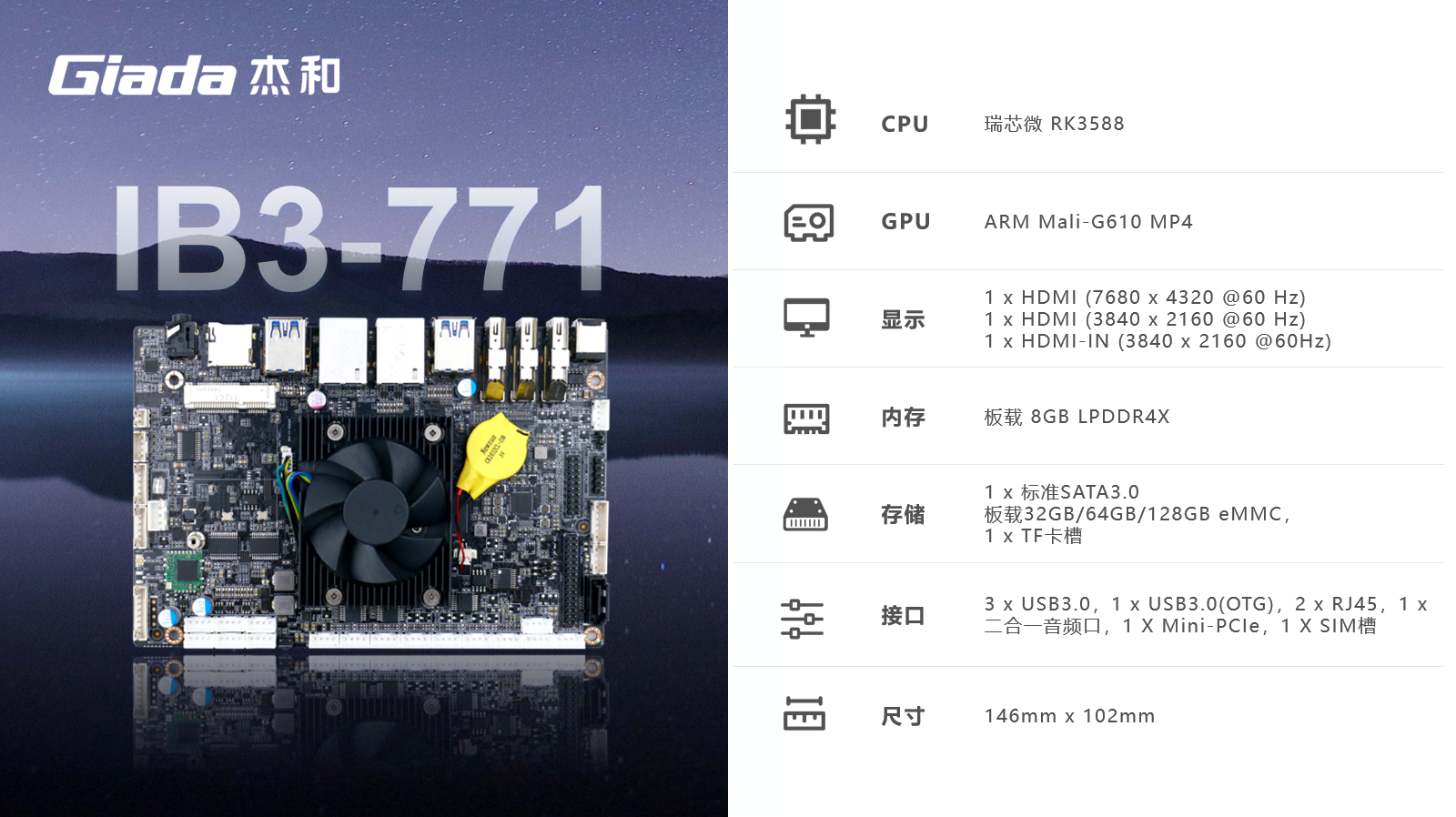 开云ARM系统IB3-771采用瑞芯微RK3588(4*A76+4*A55@2.4GHz)八核64位处理器,集成ARMMali-G610 MC4 GPU,内置AI加速NPU,提供6TOPs算力,板载8GB LPDDR4X内存,支持8K@60fpsH.265/VP9视频解码和8K@30fps H.264视频编码,进行图像及视频的高效采集和处理,可广泛应用于交互式智慧显示屏、智慧显示一体机、智能自助终端等场景。