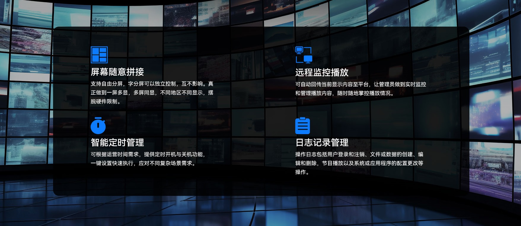 开云GDSM-ES智能零售管理系统可 实现多屏拼接/多屏分离自由选择,也可画中画显示,用户可根据场景自行灵活安排,更可以异形屏幕显示安排,让广告显示更加丰富多彩。同时,还可以轻松查看设备的基本信息,如连接状态、播放状态、播放到期时间,屏幕类型等;可对设备进行分组远程管理,远程设置定时开关机时间,控制设备音量,远程重启、远程升级,远程截屏查看实时画面等,实现屏幕智能管理。
