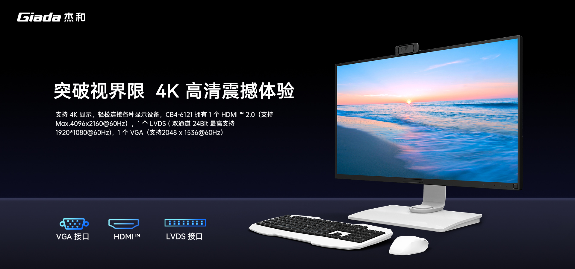CB4-6121系统提供丰富的扩展接口,满足用户不同的需求。2个DDR4 SO-DIMM插槽,支持高达64GB的内存容量;支持4K显示,拥有1个HDMI ™ 2.0(支持Max.4096x2160@60Hz),1个LVDS( 双通道 24Bit 最高支持 1920*1080@60Hz),1个VGA(支持2048 x 1536@60Hz),让您轻松连接各种显示设备。
