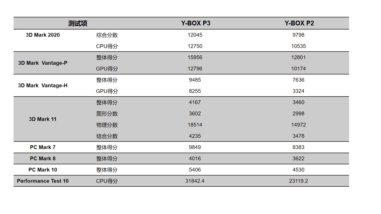 kaiyun来具体看看各个测试项目的跑分情况,kaiyun分别用3D Mark、PC Mark以及Performance 10等不同系列不同软件进行跑分,测试项目涵盖显示性能测试、系统性能测试、CPU性能测试等。通过下面的表格及柱状图可以看出,开云桌面云终端Y-BOX P3的数据在各项性能上都得到了大幅度提升。