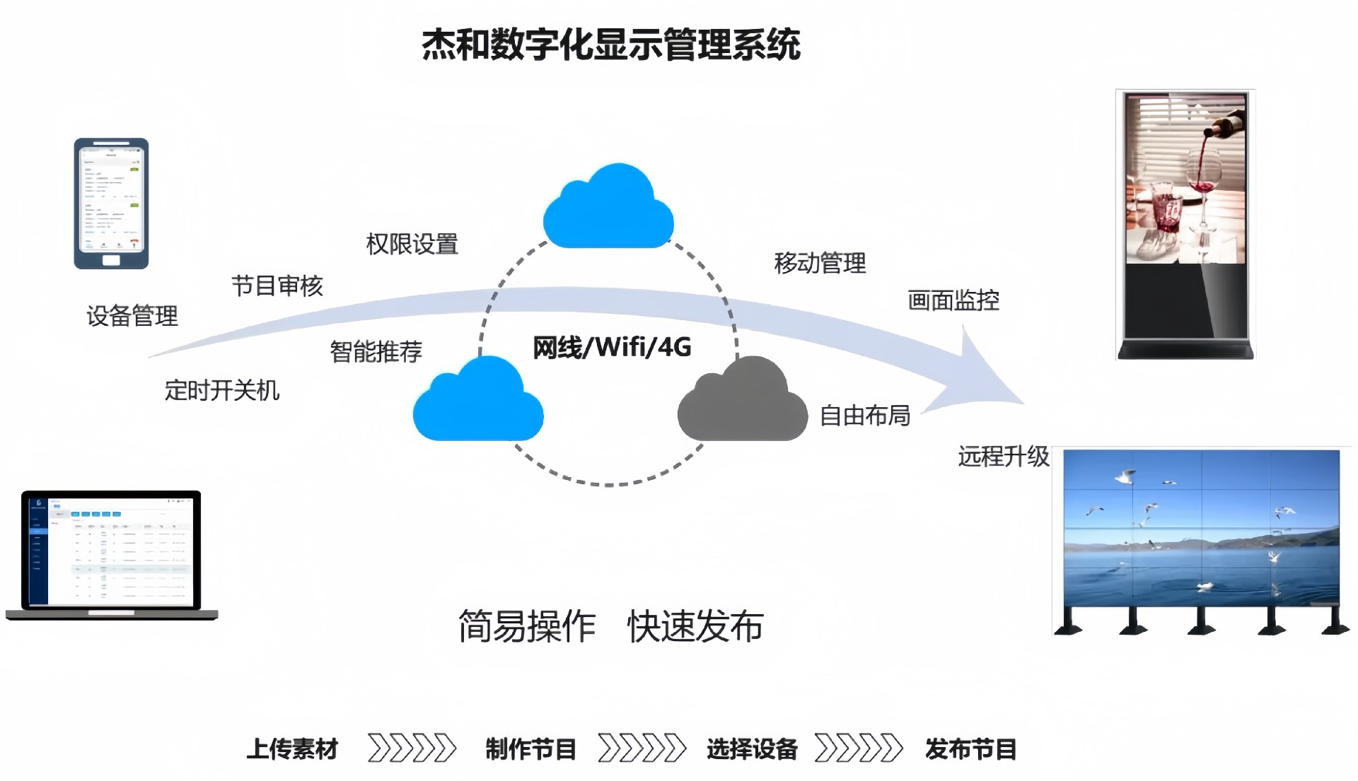 目前开云科技GDSM-ES系统覆盖市场上多形态网络智能显示终端,满足行业全产品业态需求,如广告机、LED显示屏、LCD拼接屏 、普通液晶电视等各种显示终端,广泛用于广告宣传、通知公告、指示引导。
