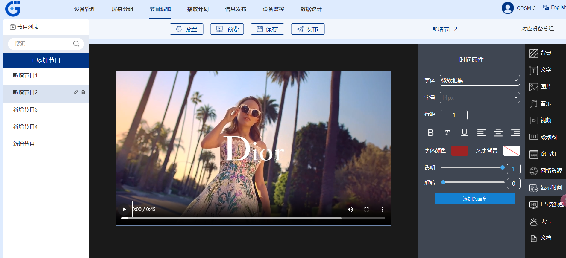 GDSM-C信息发布系统支持公有云和私有云方式部署服务器,系统提供多设备统一管理、多屏拼接、远程发布、远程监控、定时开关机、日志查询等功能。