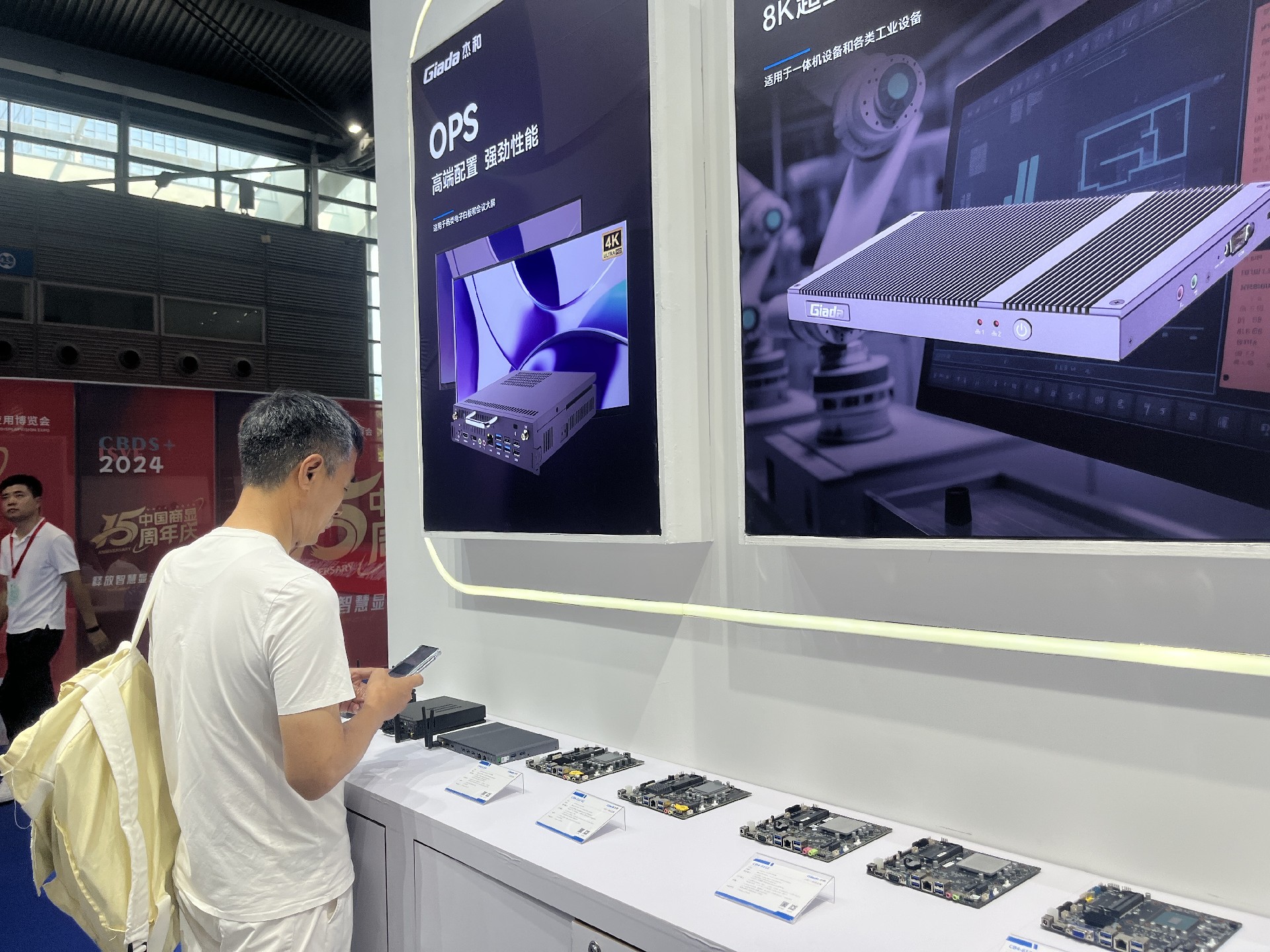 开云科技展位放置在c位的明星产品和最新产品吸引了众多参观者的目光。展台下方整齐排列着公司的产品,包括系统、嵌入式平台、OPS等,这些产品不仅适用于商业展示领域,还广泛应用于官方、制造业和教育业等多个行业。