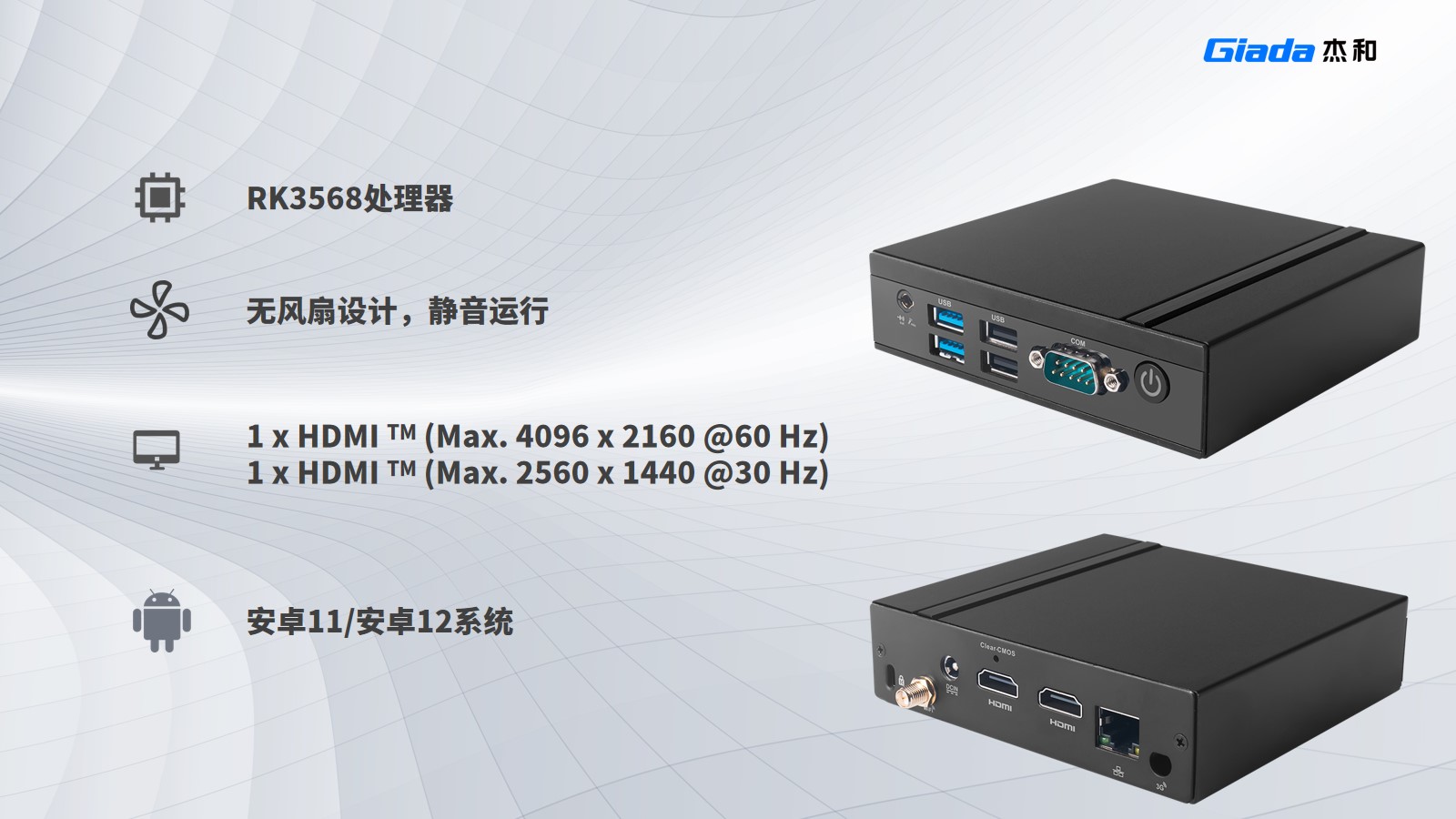DN76 支持安卓11、安卓12系统,采用瑞芯微RK3568处理器,集成了Mali-G52 GPU,这款播放器通过HDMI 2.0和HDMI 1.4,提供了两种不同的视频输出。同样采用无风扇设计以及被动散热系统,使设备运行时无噪音且防尘。