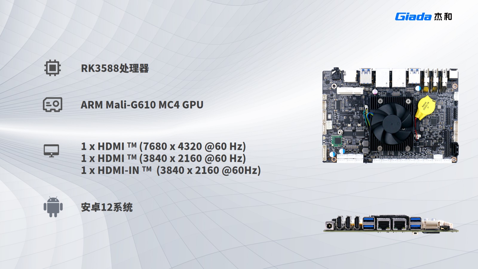 与前面几款产品对比,IB3-771拥有更强的算力,能够处理高达3200万像素的图像数据,适用于边缘计算设备和智能终端,如智能监控、官方自动化和智能零售;搭载瑞芯微RK3588处理器,支持安卓12系统,内置G610 MC4 GPU,支持8K视频硬件解码编码及多摄像头输入,提供eDP/DP/ HDMI2.1/MIPI 多种显示接口。