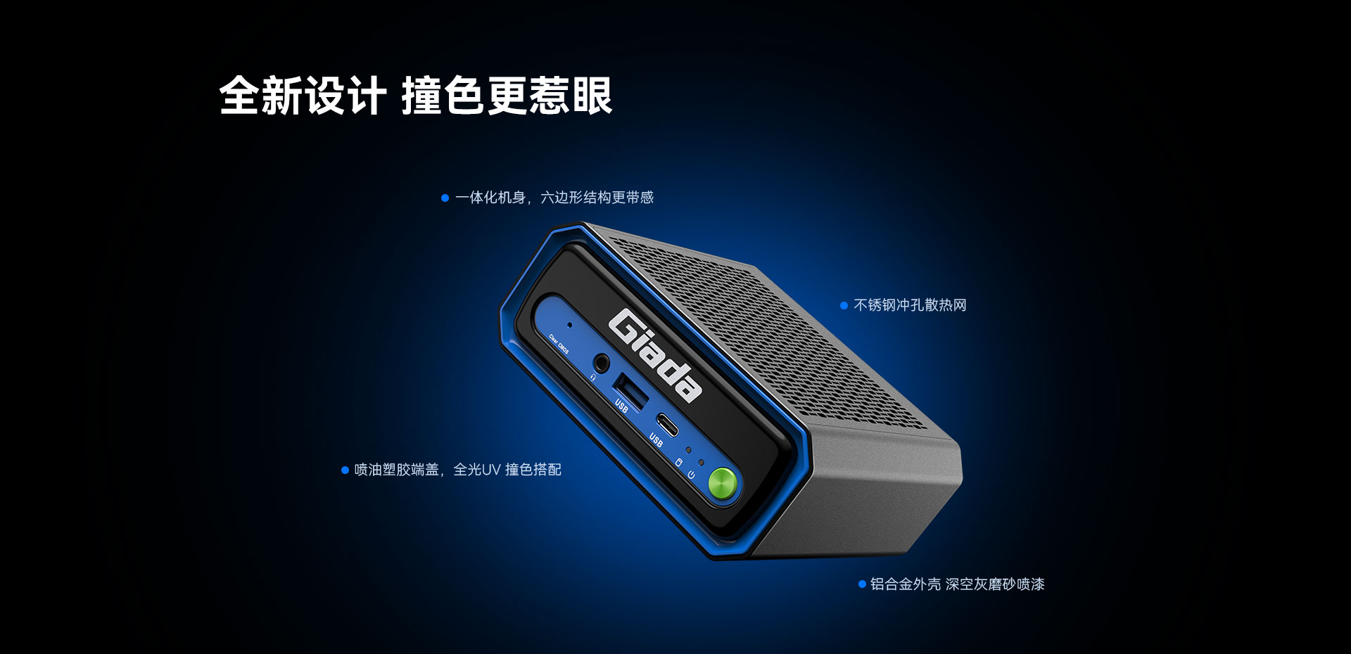 N601不同于传统官方风设计,炫酷的一体化机身,顶面为不锈钢冲孔散热网,正面是六边形结构,全光UV 撞色搭配,喷油塑胶端盖,铝合金外壳,美感与功能兼具。
