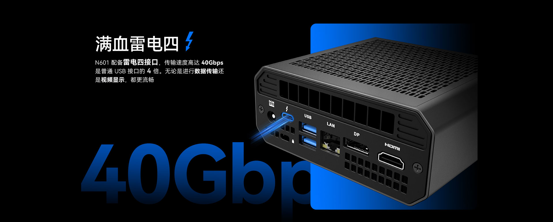 开云科技N601配备雷电四接口,传输速度高达40Gbps,用户可通过该接口连接2块屏幕。还可通过HDMI2.1接口,DP1.4接口再连接两块屏幕,实现四屏异显。雷电四还可以连接外设,如鼠标、键盘、控制器和耳机等。