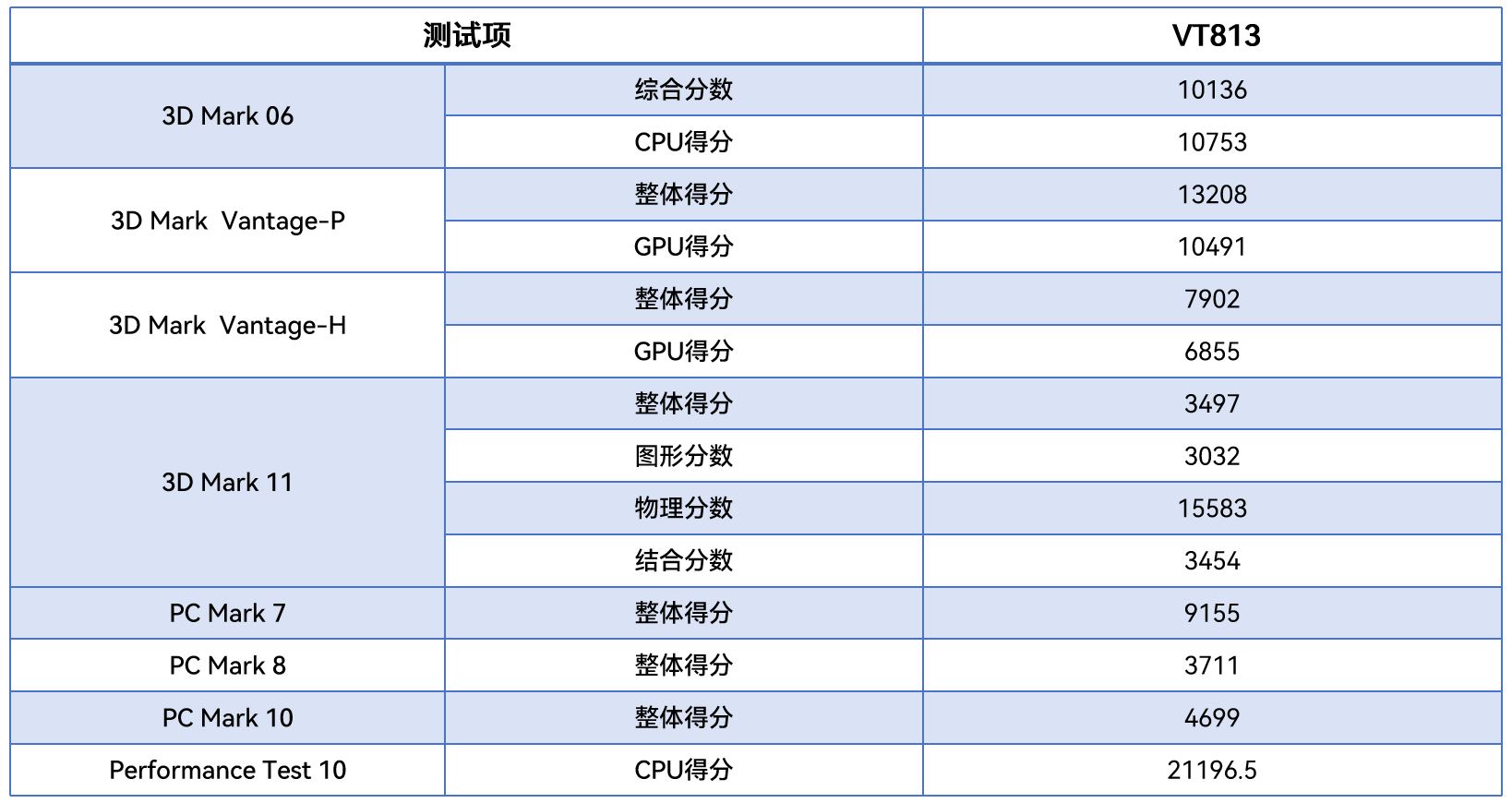 其中,VT813的Performance的综合得分为P13208,High的综合得分为H7902,这表明VT813应对能应对 4K游戏、3D渲染、视频编辑等高性能需求场景。