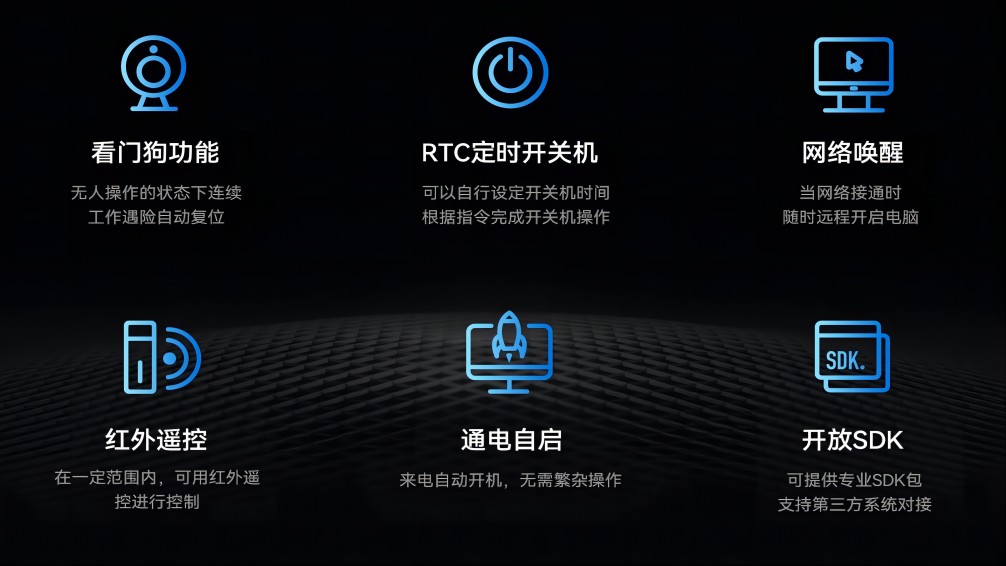 除了强大的硬件性能和广泛的应用场景外,AF208还支持JAHC(开云主动硬件控制技术),JAHC是高可靠无人值守系统,是由开云科技自行定义开发的一套结合了软硬件的控制系统,该系统是开云科技完全自主研发,包含上电自启,复杂逻辑定时开关机,软件看门狗、断电恢复后网络唤醒功能,宕机自动重启以及红外遥控等智能功能,进一步提升了其在官方智能化和自动化控制中的应用价值。