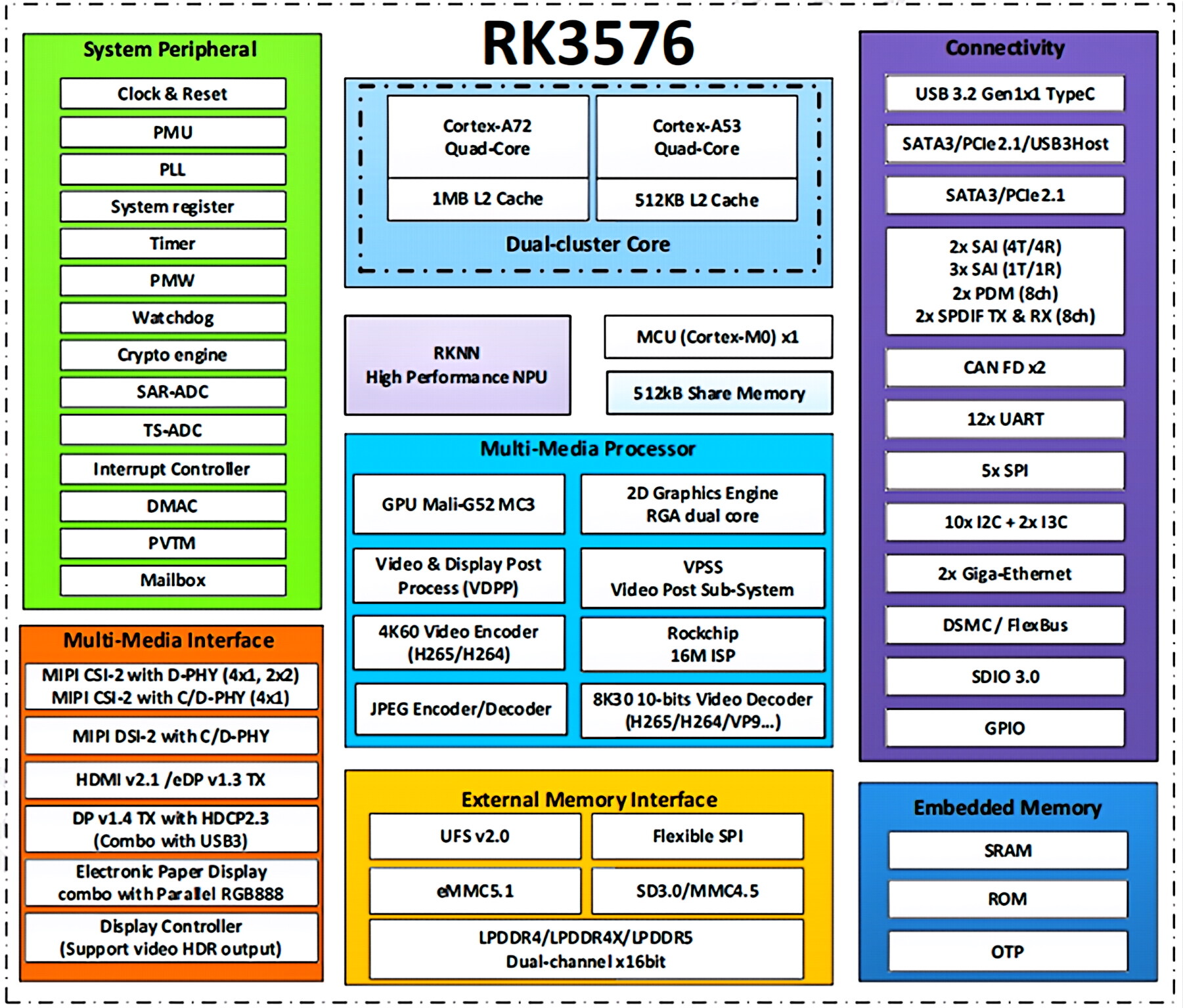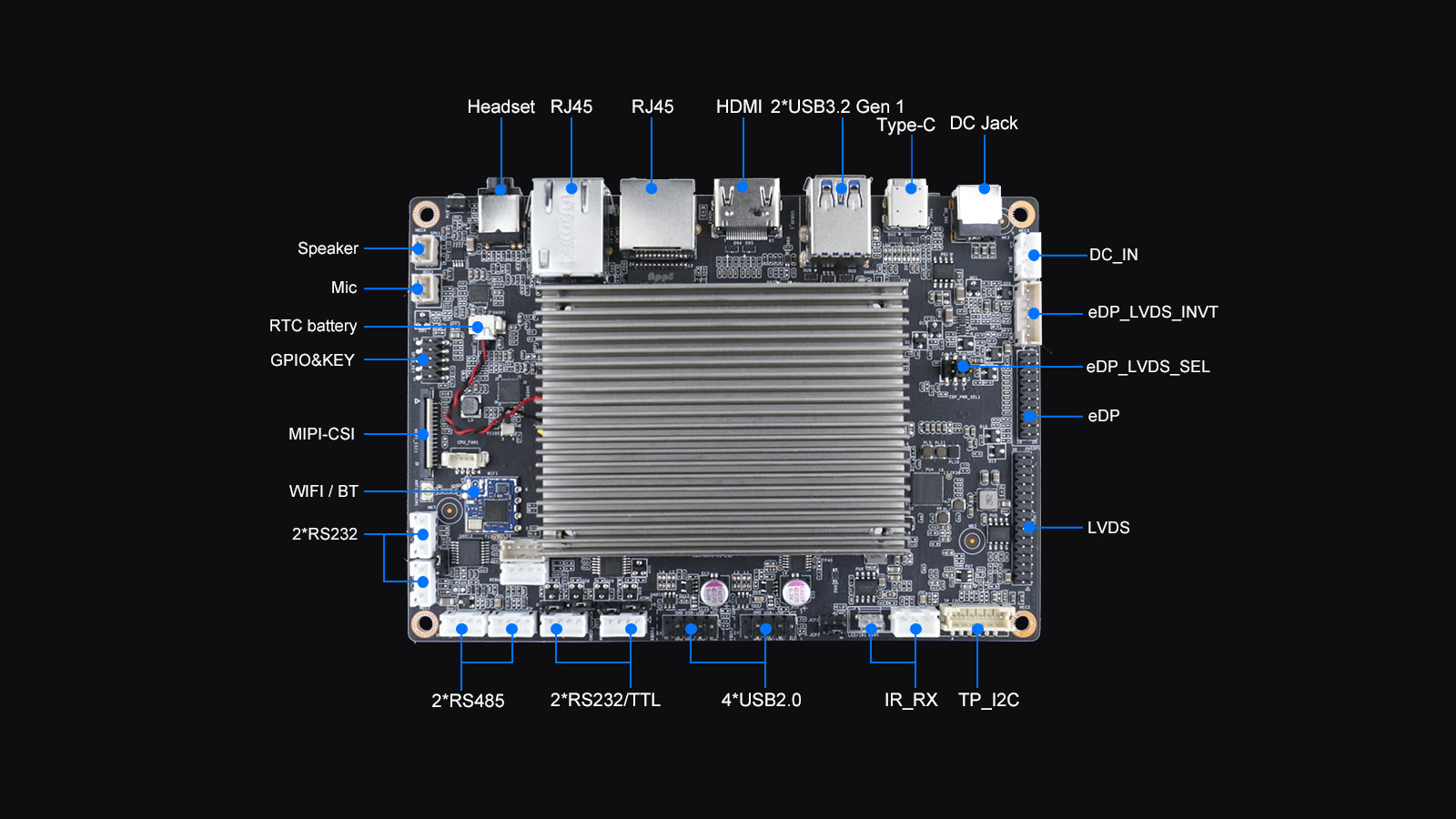 在内存与存储方面,该系统板载LPDDR4X内存,最大支持16GB容量;支持1个eMMC(最大128GB)和1个Micro SD卡槽,满足用户多样化的存储扩展需求。