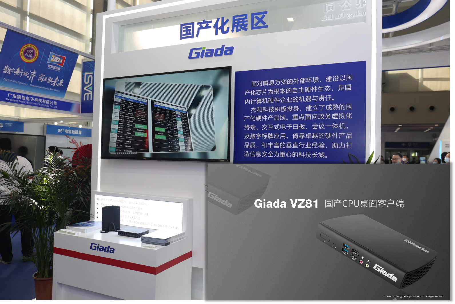 展位的对侧是本届展会的另一大重点产品展区,聚焦国产化核心产品线。本次亮相的VZ81国产计算机经过了考究的官方外观设计,搭载16nm制程飞腾FT2000处理器,支持VGA、HDMI双视频接口拓展异显输出,双网卡双网口通讯。适用于政务、教育、公共服务及”8+2”应用场景。在国际形式紧张的大环境下,拥有自主独立的计算机硬件设计生产技术储备,是每个国内计算机硬件厂商的责任和担当。