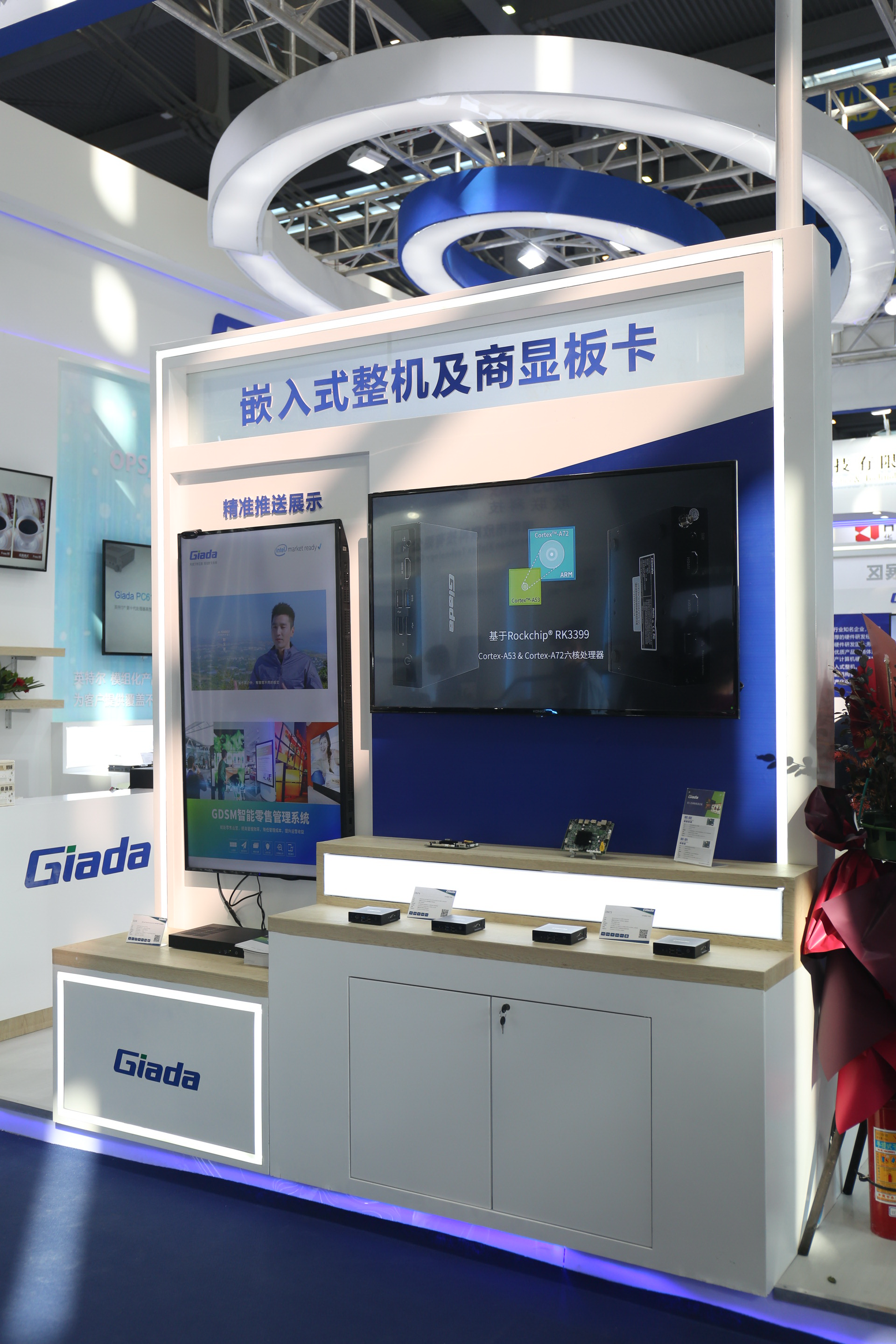 紧邻ARM架构商显产品集的精准推送展示区与零售门店模拟展区,共同组成了本届展会开云科技展位的一大精彩设计。场景展现了GDSM智能零售管理系统在零售门店场景下的展示效果,顶部的数字标牌由GDSM系统推送内容,模拟搭建了针对人流动线的广告精准推送形态。