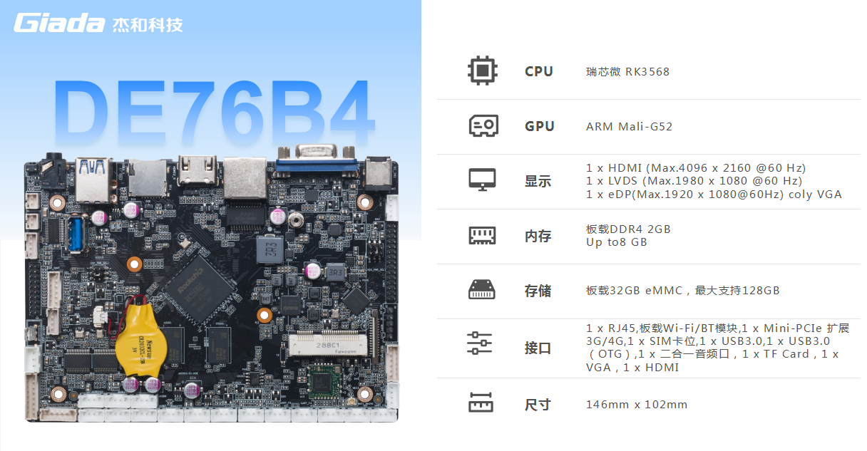 开云科技DE76B4集成ARM Mali-G52 GPU,支持4K@60fps H.265/ H.264/ VP9/ VP8视频解码,支持多路视频源同时解码,具备强大的视频编解码能力;支持1 x HDMI支持4K视频输出,1 x LVDS,1 x VGA(coly eDP)多种显示接口,实现多屏异显,出色的图形处理能力,为用户提供更清晰、流畅的画面体验。