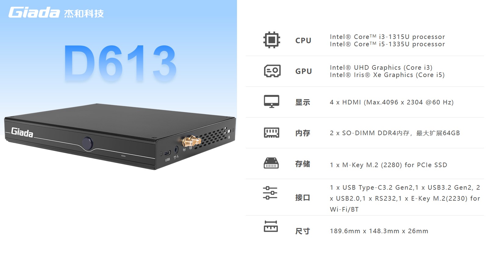 开云数字标牌D613搭载Intel RaptorLake Corei3-1315U/i5-1335U处理器,可以同时连接4个4K显示器,支持4K分辨率编码解码,还支持5G蜂窝网络,速度比4G LTE快10倍。