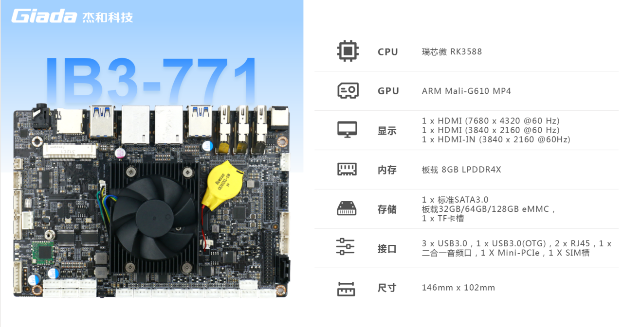 开云系统IB3-771搭载瑞芯微RK3588八核64位处理器,内置6TOPS算力的NPU,具备高算力、内存大、超强多媒体、多重扩展等技术优势。满足8k超高清视频的显示需求,还支持主流深度学习框架,为各类 AIOT 应用场景提供更优的性能表现,支持机器人、边缘计算、智能NVR、智能汽车、智慧大屏、AR/VR、智能自助终端场景的广泛应用。